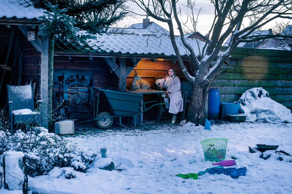 ‘Two beers and no puppy‘ is an exhibition by Charlotte Lybeer and Liesbeth Marit, at GC De Markten, Brussels in 2022. In this exhibition, the photographers show work made during the corona years. A visible urge to escape, an attempt to evoke a dream world. With Marit in her creations of cinematic fantasies, with Lybeer by finding fiction in everyday reality. Despite the different starting point, the theme of the ‘female figure’ is central to both works. The exhibition reflects how people respond to a changing world. In the wake of Covid-19, a shrinking world that limits our freedom but at the same time encourages us to push our limits of imagination.